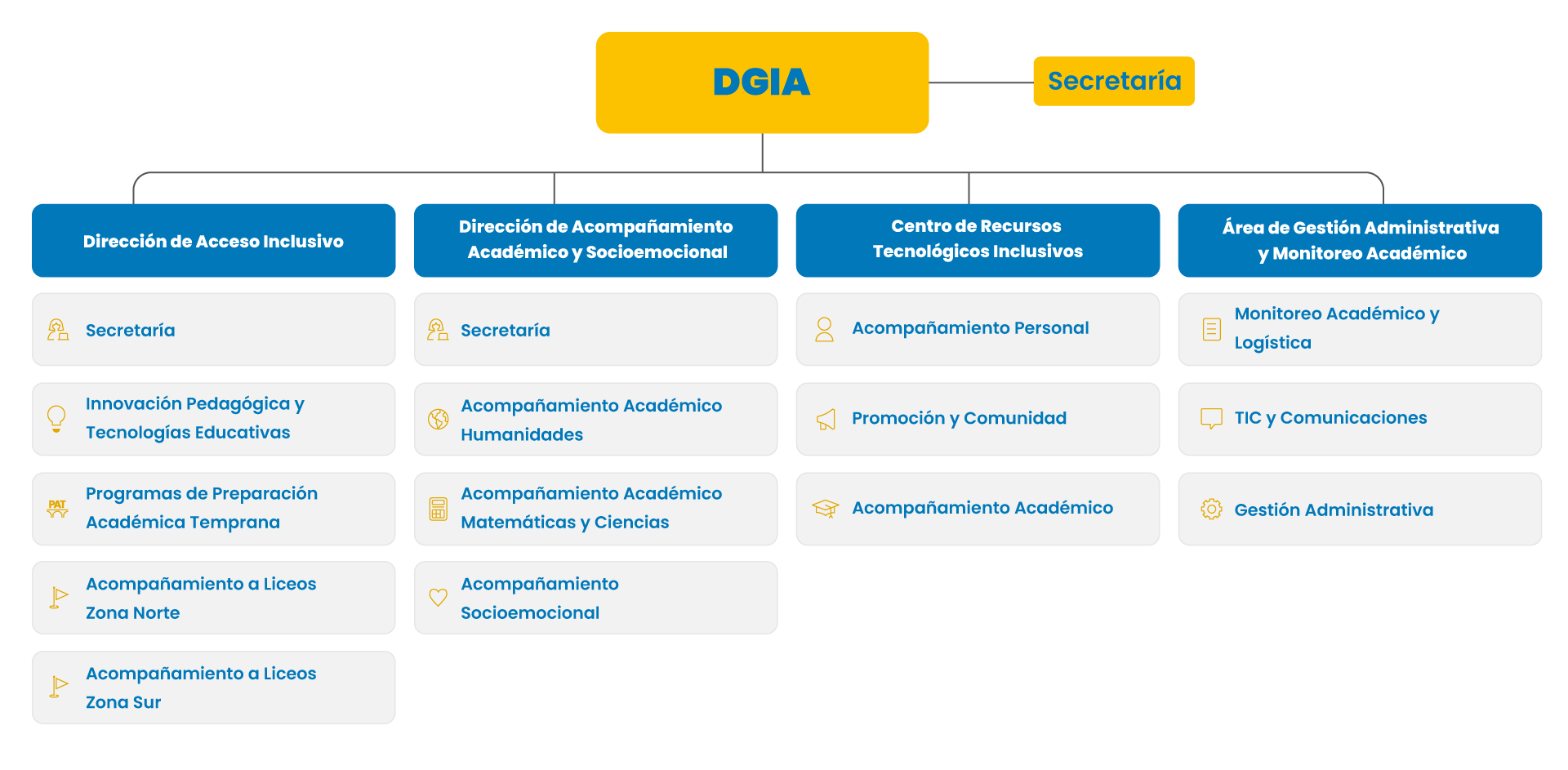 La Dirección General de Inclusión y Acompañamiento Académico (DGIA), creada en 2016, es una de las tres Direcciones Generales que componen la Vicerrectoría Académica, junto a la Dirección General de Docencia y la Dirección General Estudiantil. Su rango de Dirección General ratifica e institucionaliza el compromiso de la Universidad Católica de Temuco con la inclusión.